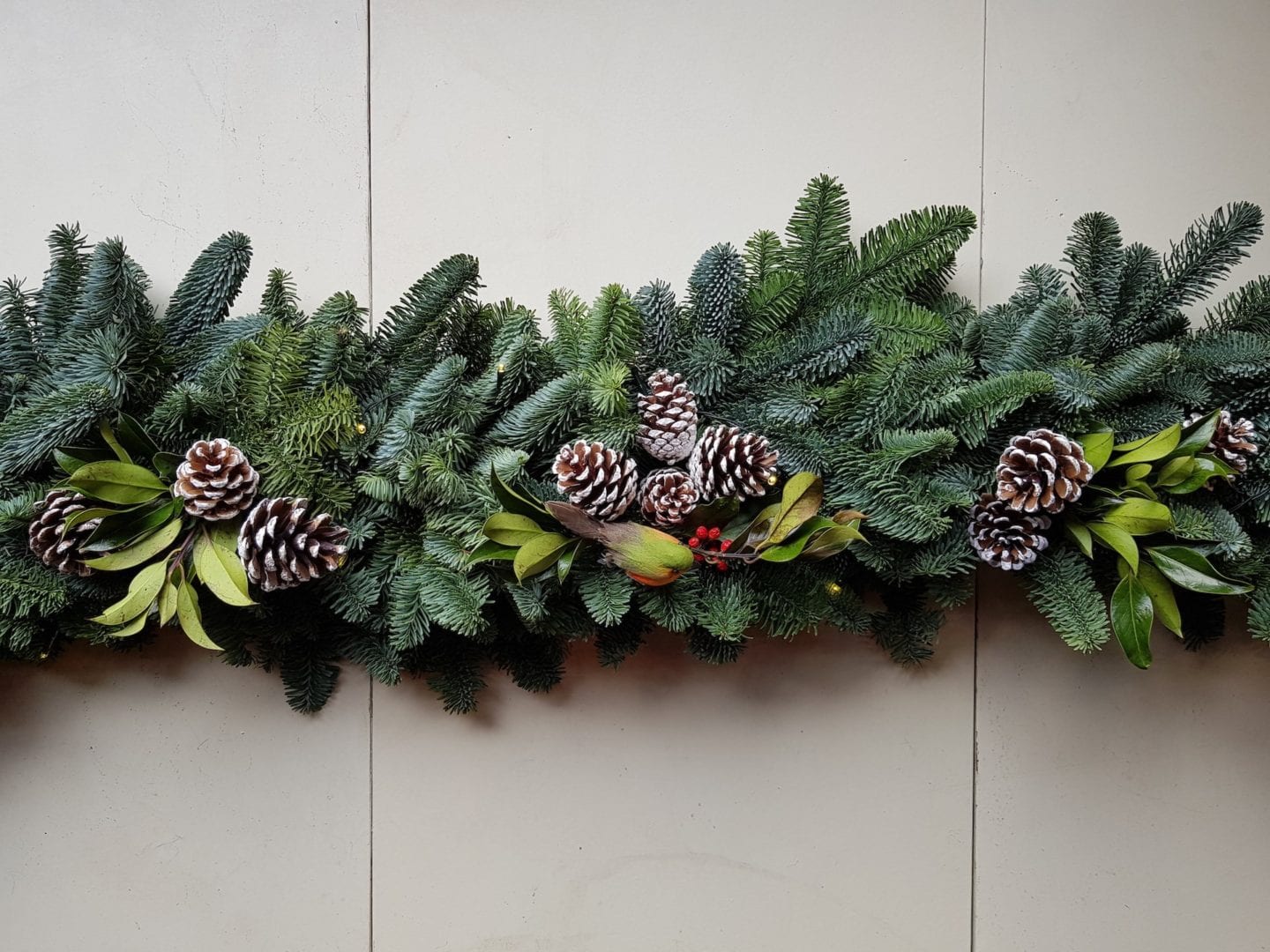 Tasteful fresh handmade garland. Professionally arranged by a local florist. Featuring a flexible frame to fit your door or fireplace, seasonal foliage, fir cones and centred with a festive robin.